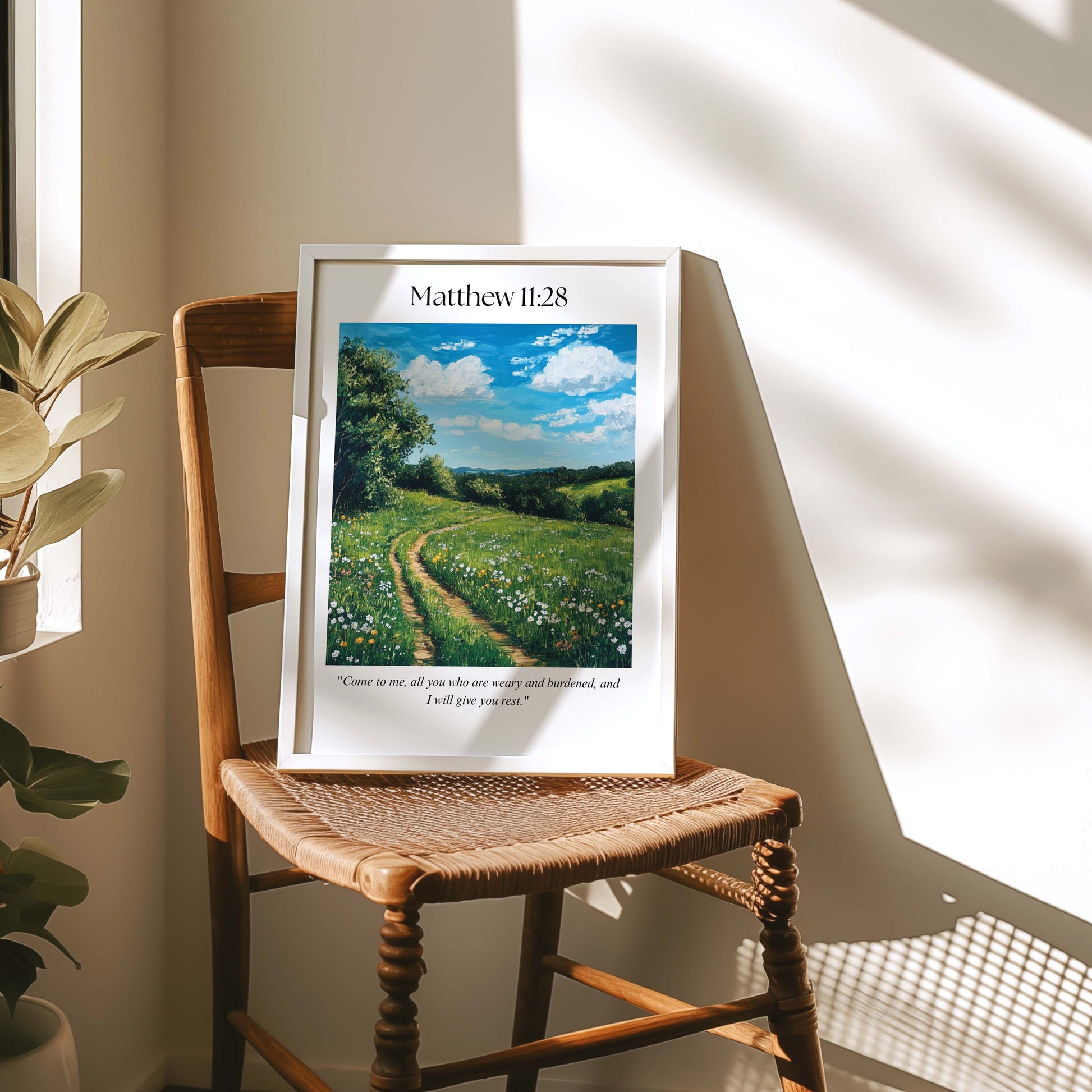 This Matthew 11:28 scripture wall art captures a peaceful moment with its sunlit meadow and soft winding path. The artwork mirrors Jesus’ invitation to release your burdens and find real rest in Him. It’s a calming piece of Christian wall art that brings warmth, comfort, and gentle encouragement to any room in your home.