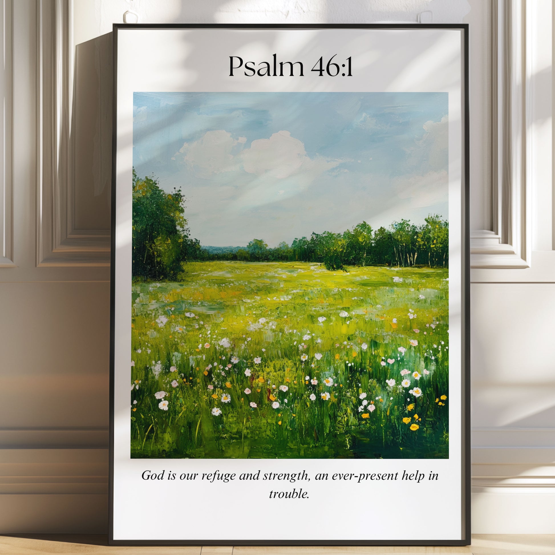 This Psalm 46:1 print blends a serene landscape with a timeless message of God’s help. The gentle meadow symbolizes the calm He provides, even when life feels overwhelming. A meaningful addition to your Christian home decor.